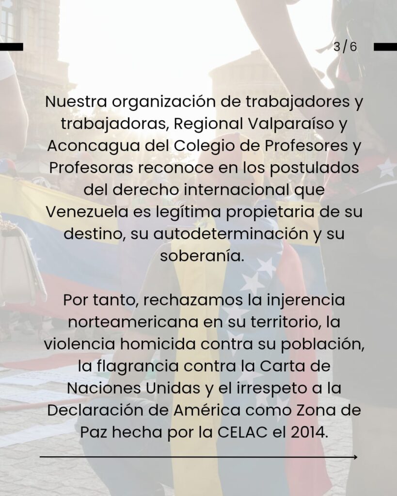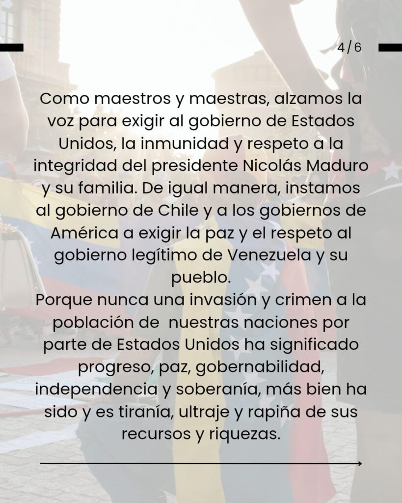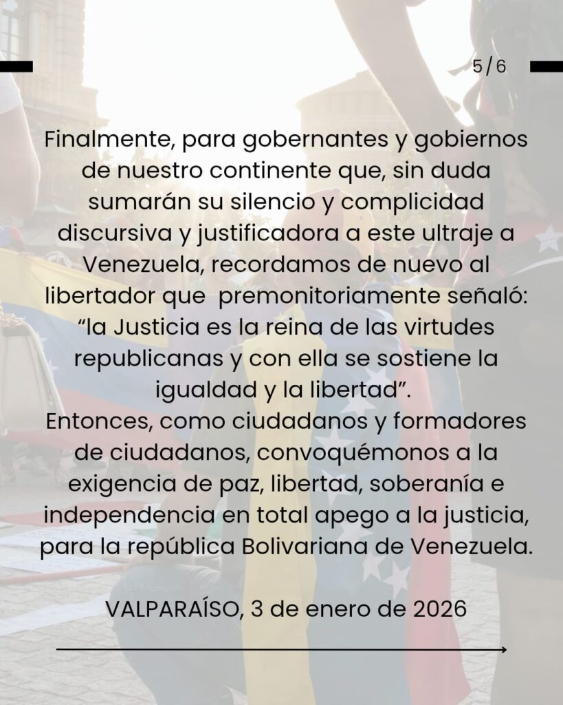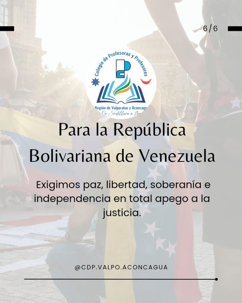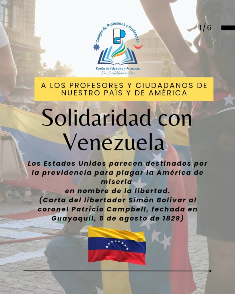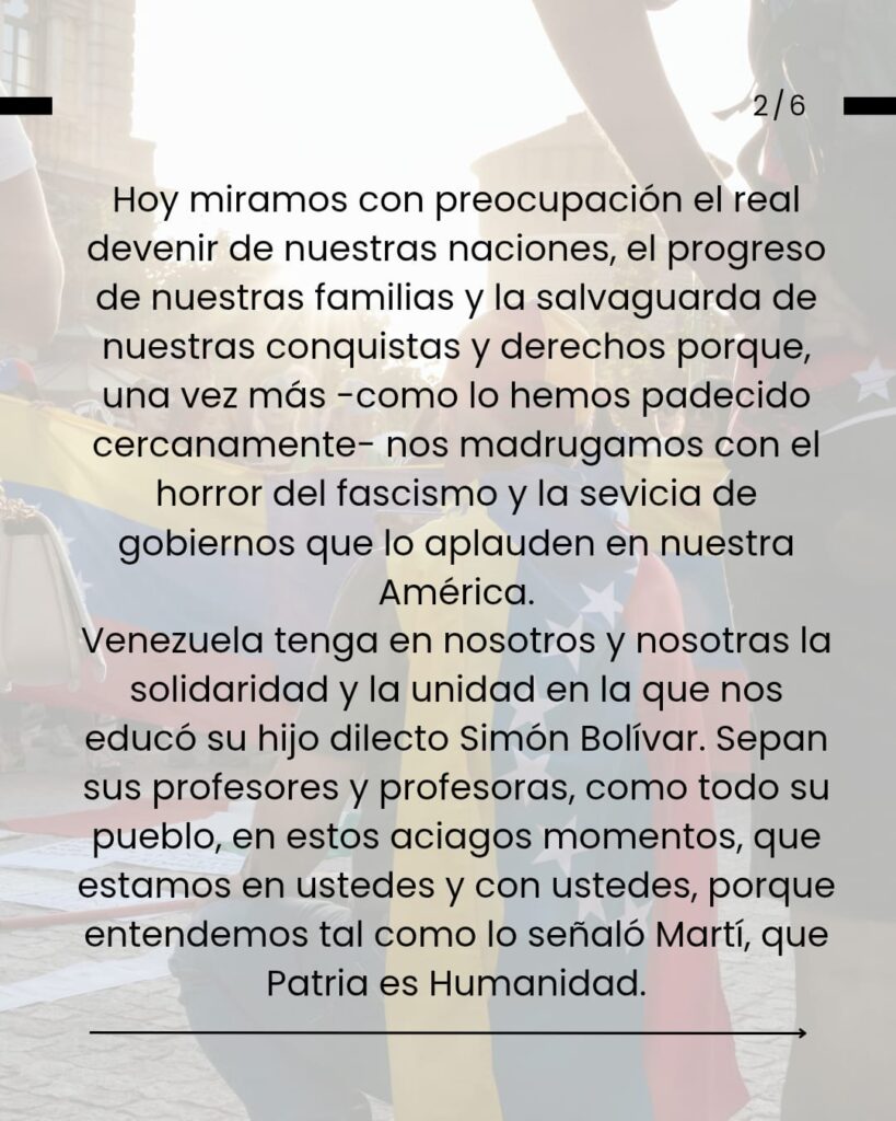 Venezuela tenga en nosotros y nosotras la solidaridad y la unidad en la que nos educó su hijo dilecto Simón Bolívar. Sepan sus profesores y profesoras, como todo su pueblo, en estos aciagos momentos, que estamos en ustedes y con ustedes, porque entendemos tal como lo señaló Martí, que Patria es Humanidad.